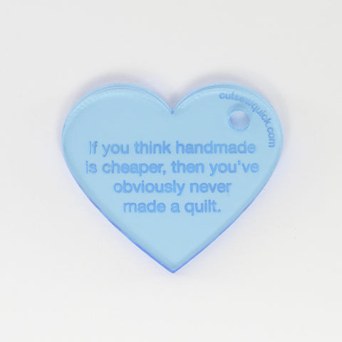 A heart shaped keychain with the text “If you think handmade is cheaper, then you've obviously never made a quilt.”.